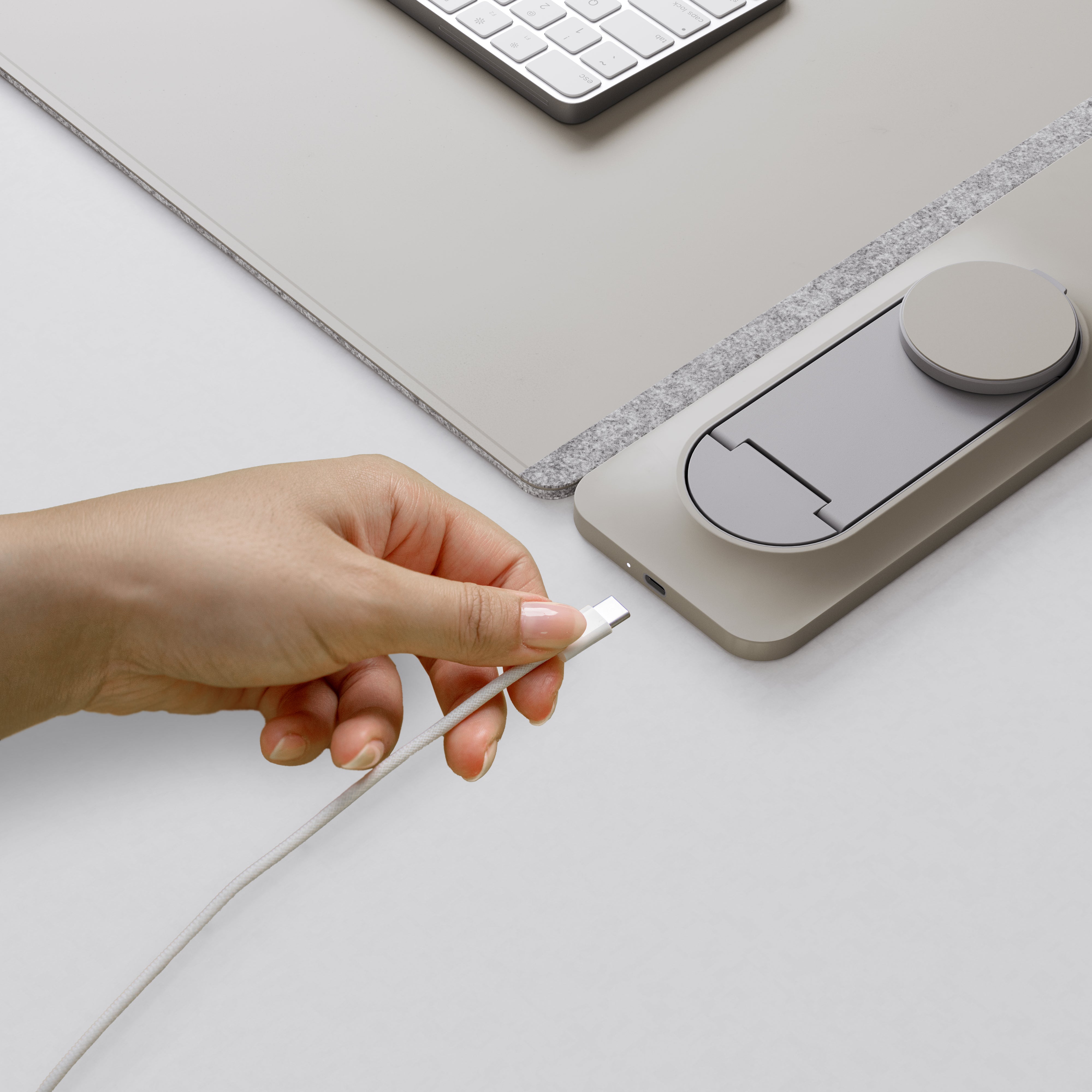 Plug a USB-C charger cable connector (included) into the wireless charging panel’s USB-C port. Plug the other end of your cable into a USB-C wall charger. A wall charger that delivers at least 30W is recommended for best results.