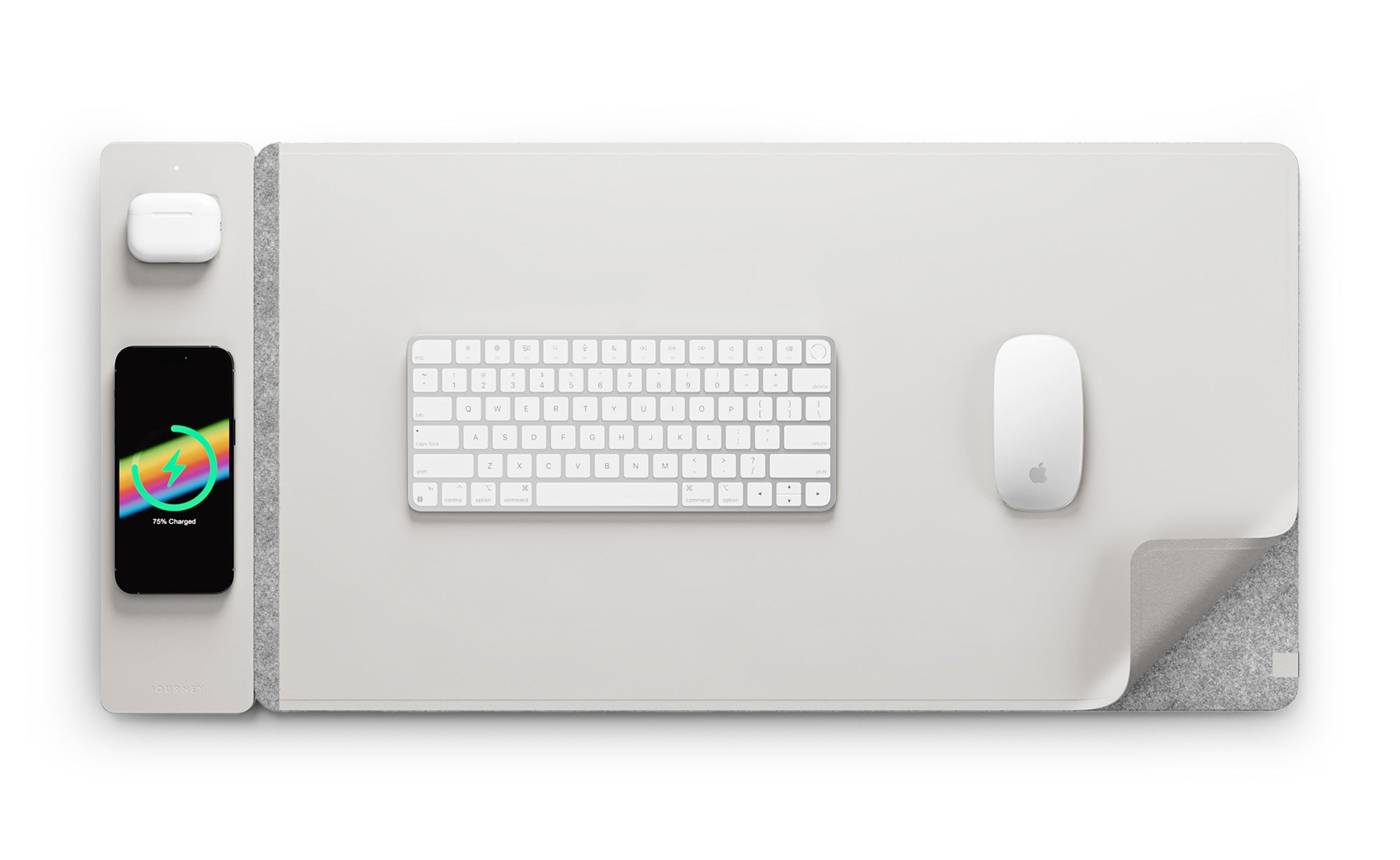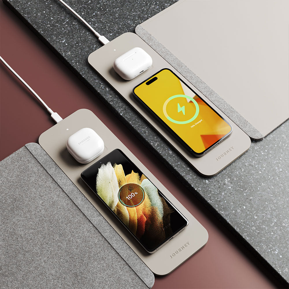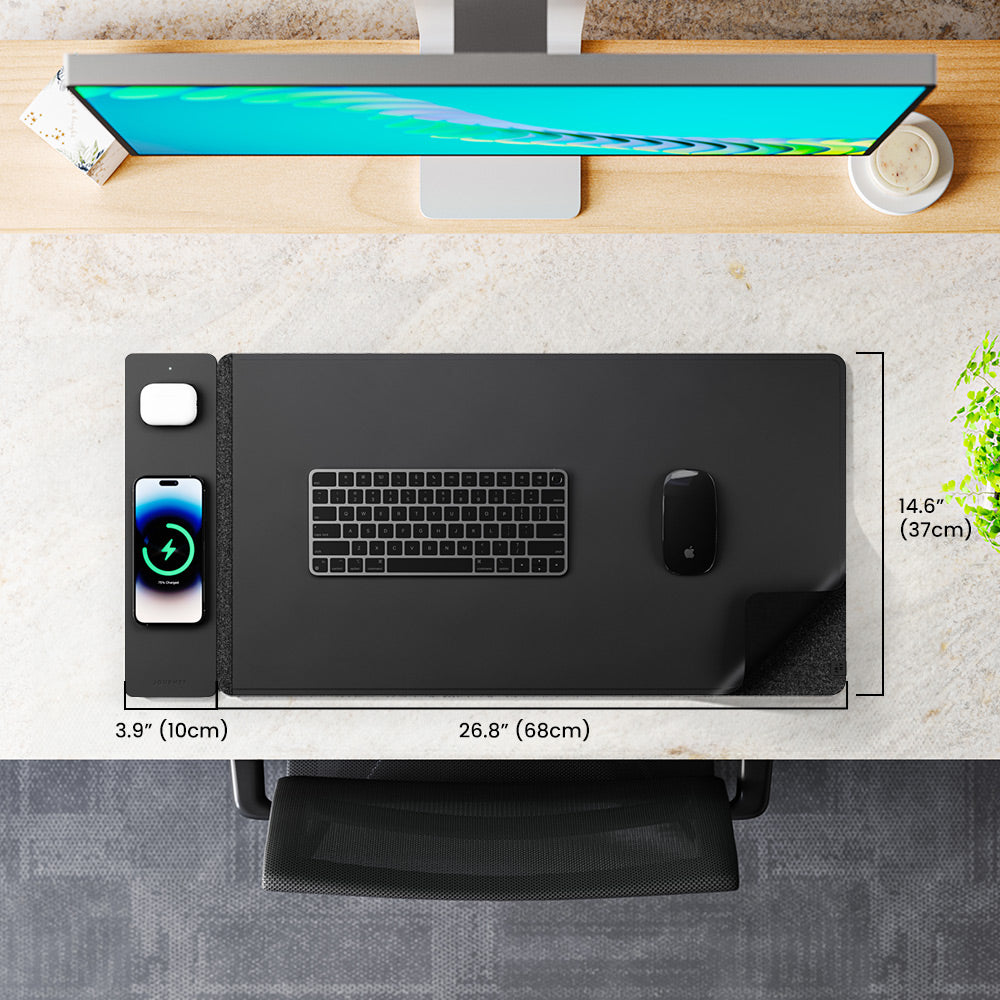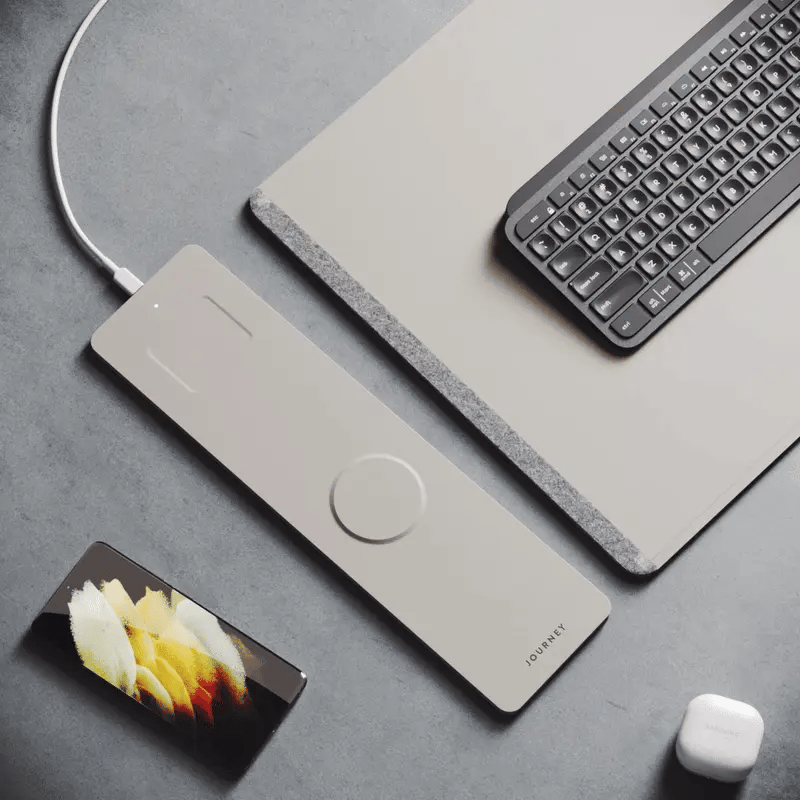 Reversible Desk Mat with a detachable wireless charging panel that fast charges your smartphone and earbuds simultaneously. Features water-resistant vegan leather on one side and plush felt on the other side.