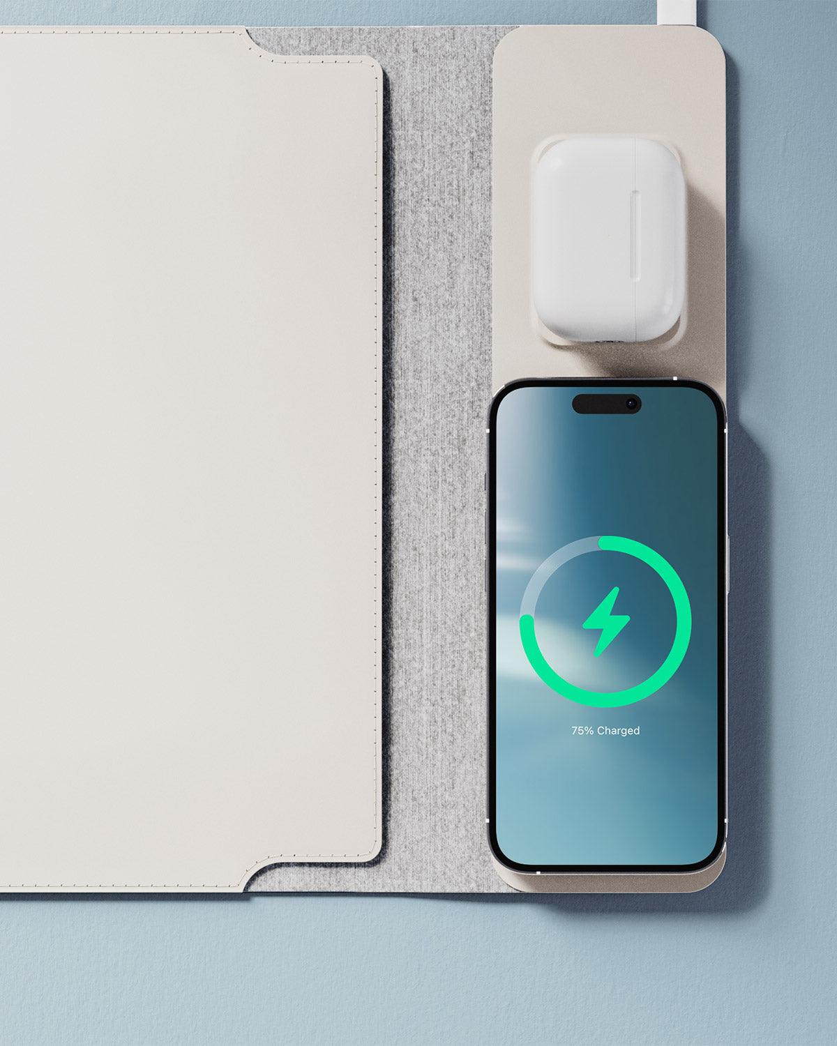 Upgrade your work and travel experience with our innovative NEXA laptop sleeve. This sleek and stylish accessory not only safeguards your laptop but also boasts a built-in dual wireless charger for your phones and earbuds, ensuring you stay powered up on the go. Additionally, it doubles as a portable deskmat or mouse pad, providing you with a versatile workspace wherever you are. Elevate your productivity and protect your tech with this multifunctional laptop sleeve.