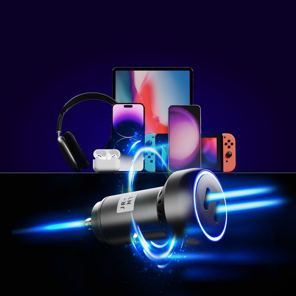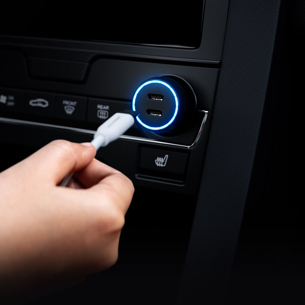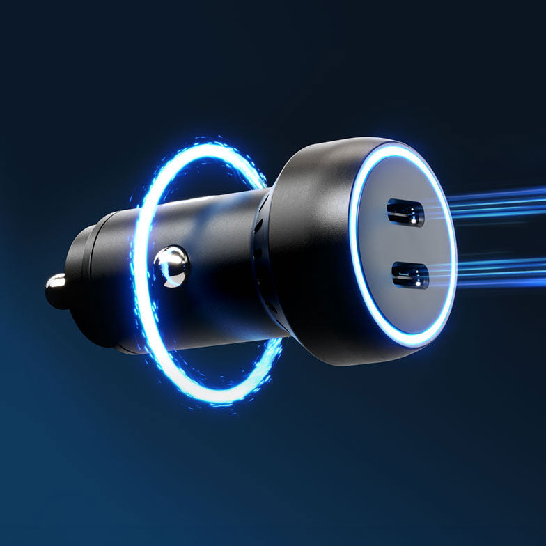 Stay fully charged during your road trips with PULSE 60, our high-powered 60W car charger featuring dual USB-C ports for simultaneous device charging.
