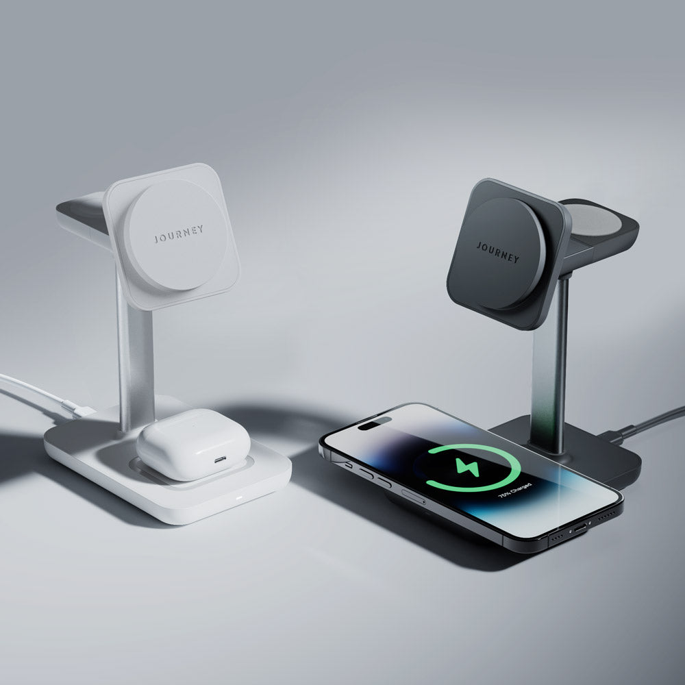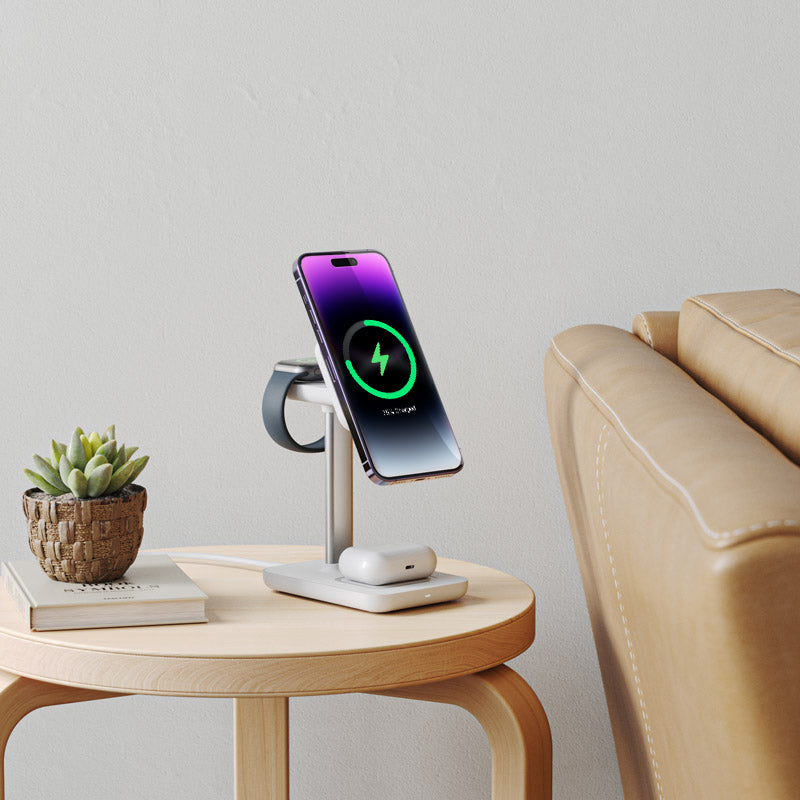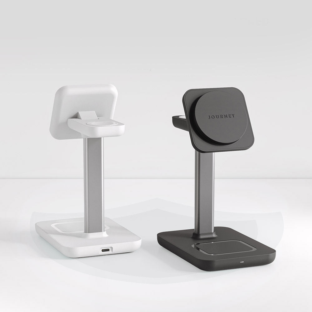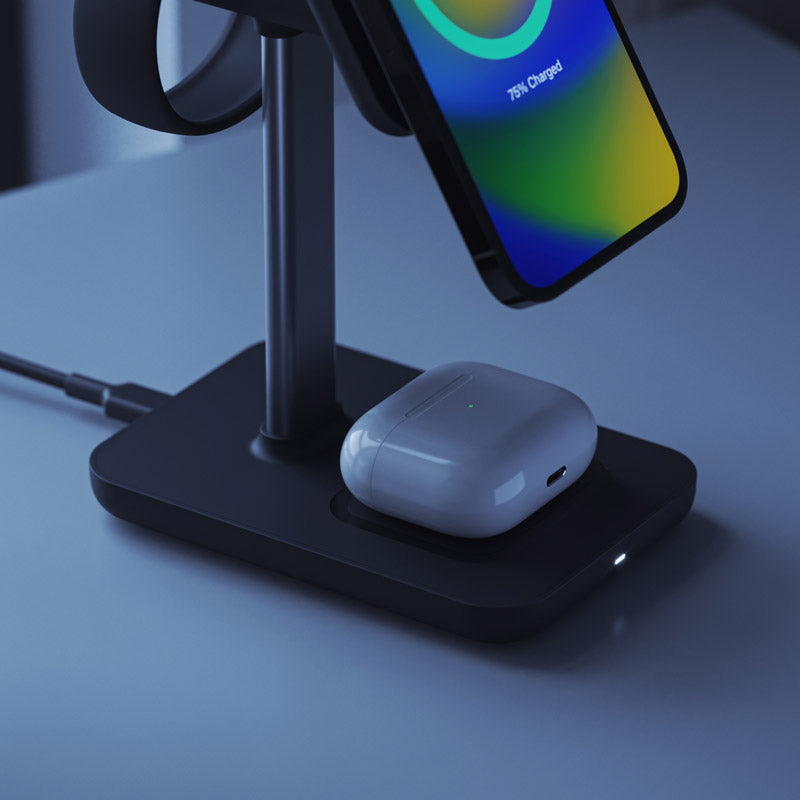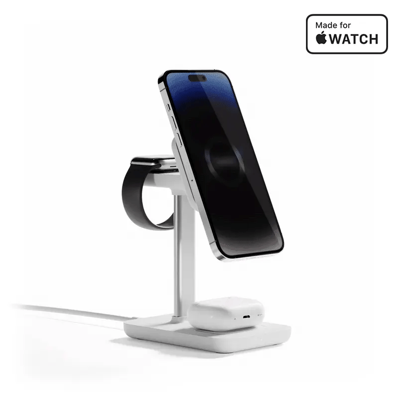 The RAPID TRIO Wireless Charging Stand simultaneously powers your iPhone/AirPods/Apple Watch. Simplify your charging routine with a speedy all-in one power solution that eliminates ugly cable clutter. The MagSafe-compatible RAPID TRIO, which also acts as a stand for your phone screen, offers maximum ergonomic support and single-handed operation.