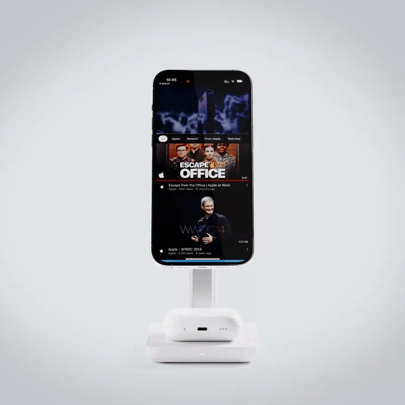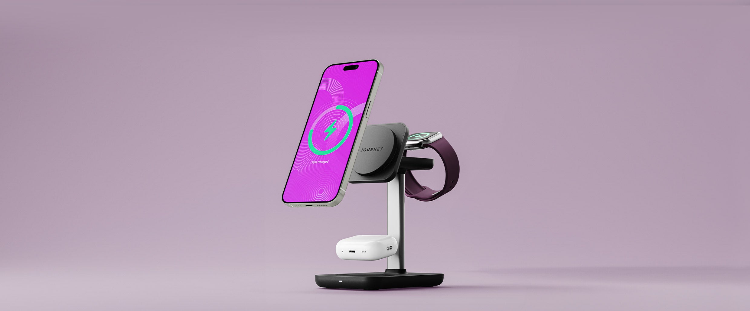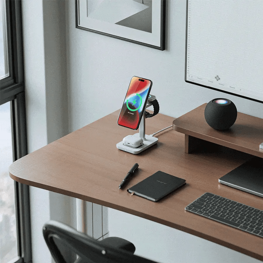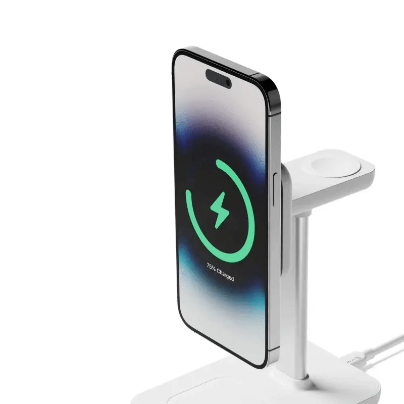 The RAPID TRIO Wireless Charging Stand simultaneously powers your iPhone/AirPods/Apple Watch. Simplify your charging routine with a speedy all-in one power solution that eliminates ugly cable clutter. The MagSafe-compatible RAPID TRIO, which also acts as a stand for your phone screen, offers maximum ergonomic support and single-handed operation.