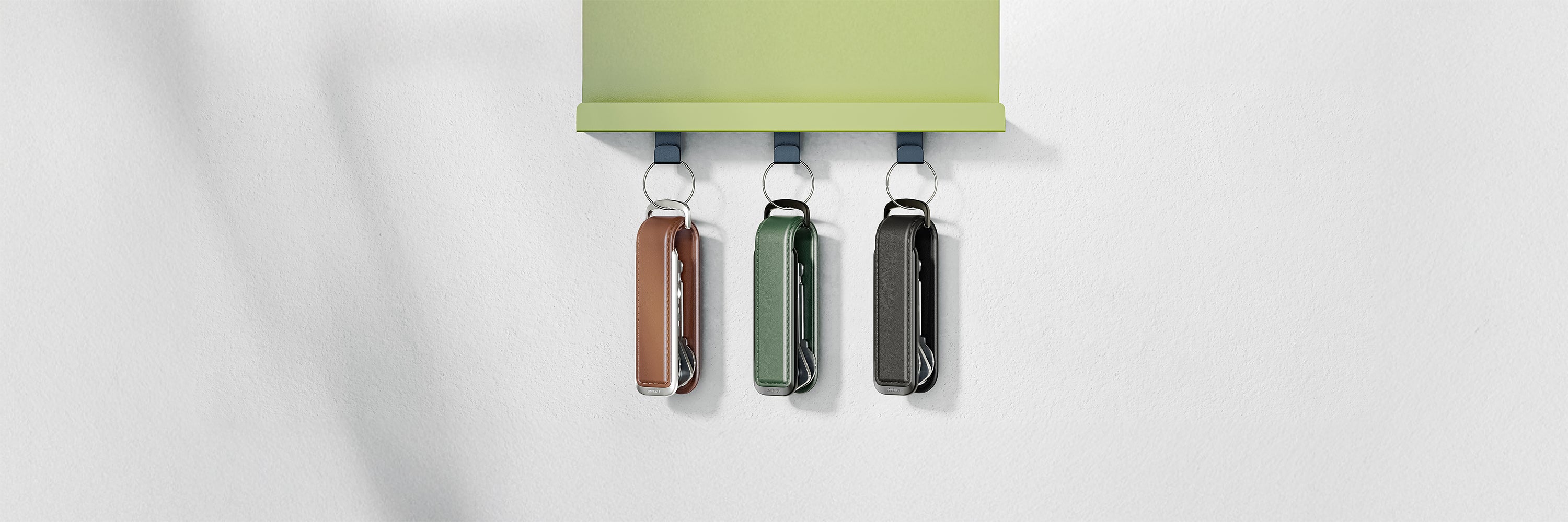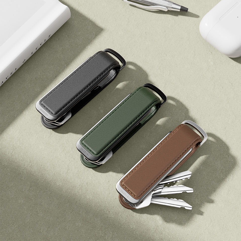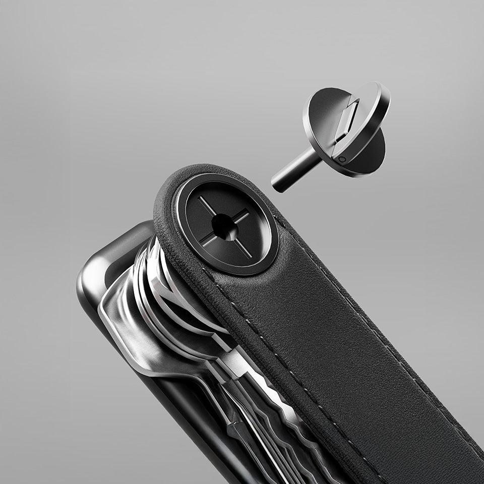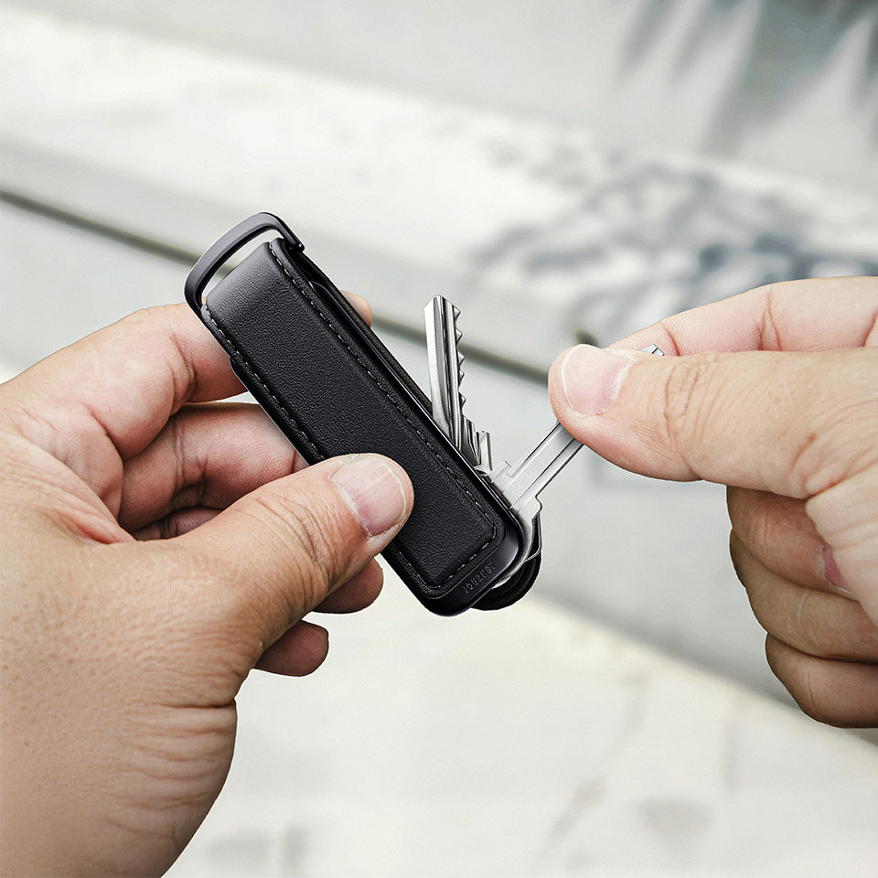 A. A minimalist key organiser made with Nappa leather and stainless-steel hardware. It stores up to six flat keys in a compact, silent stack and eliminates key jingling.