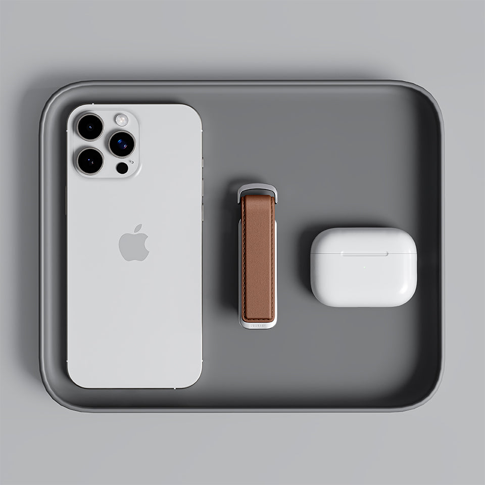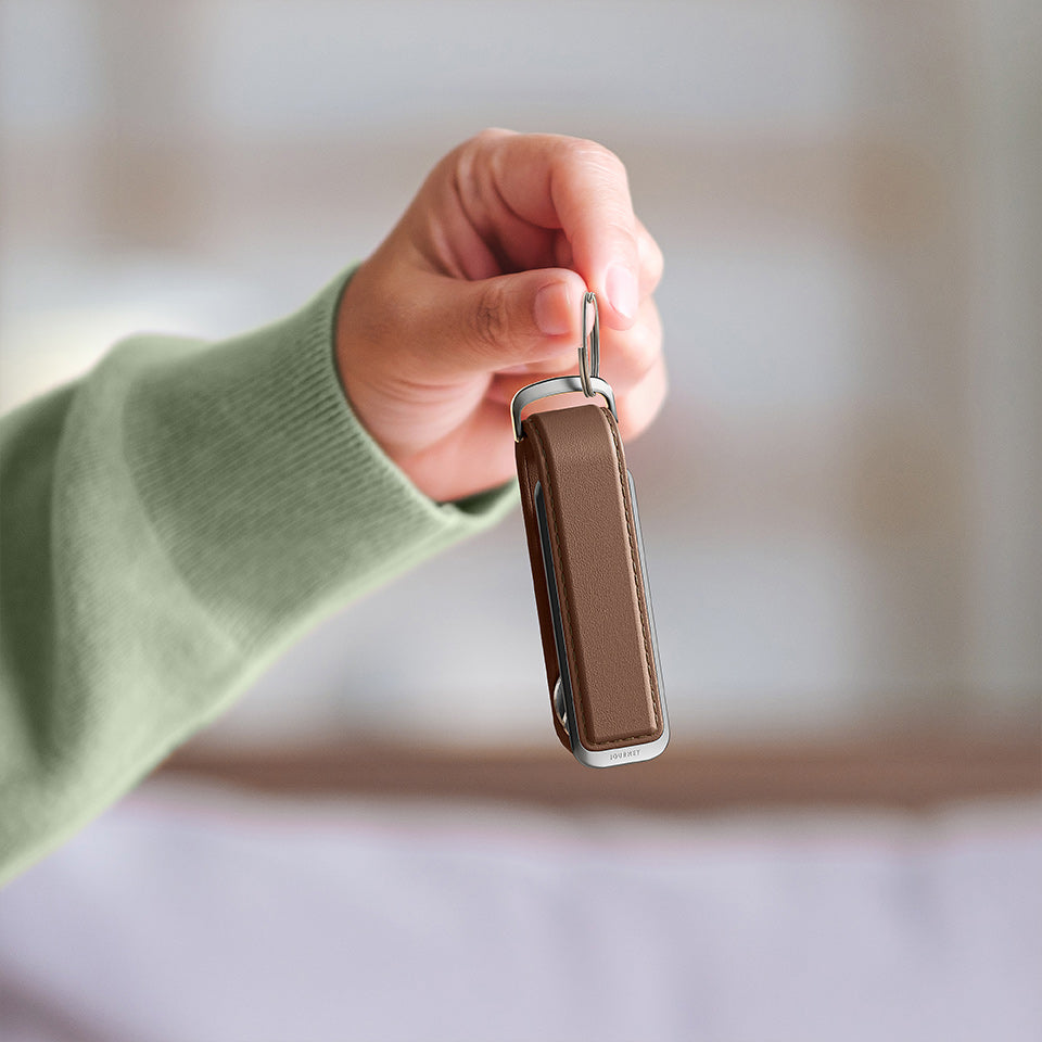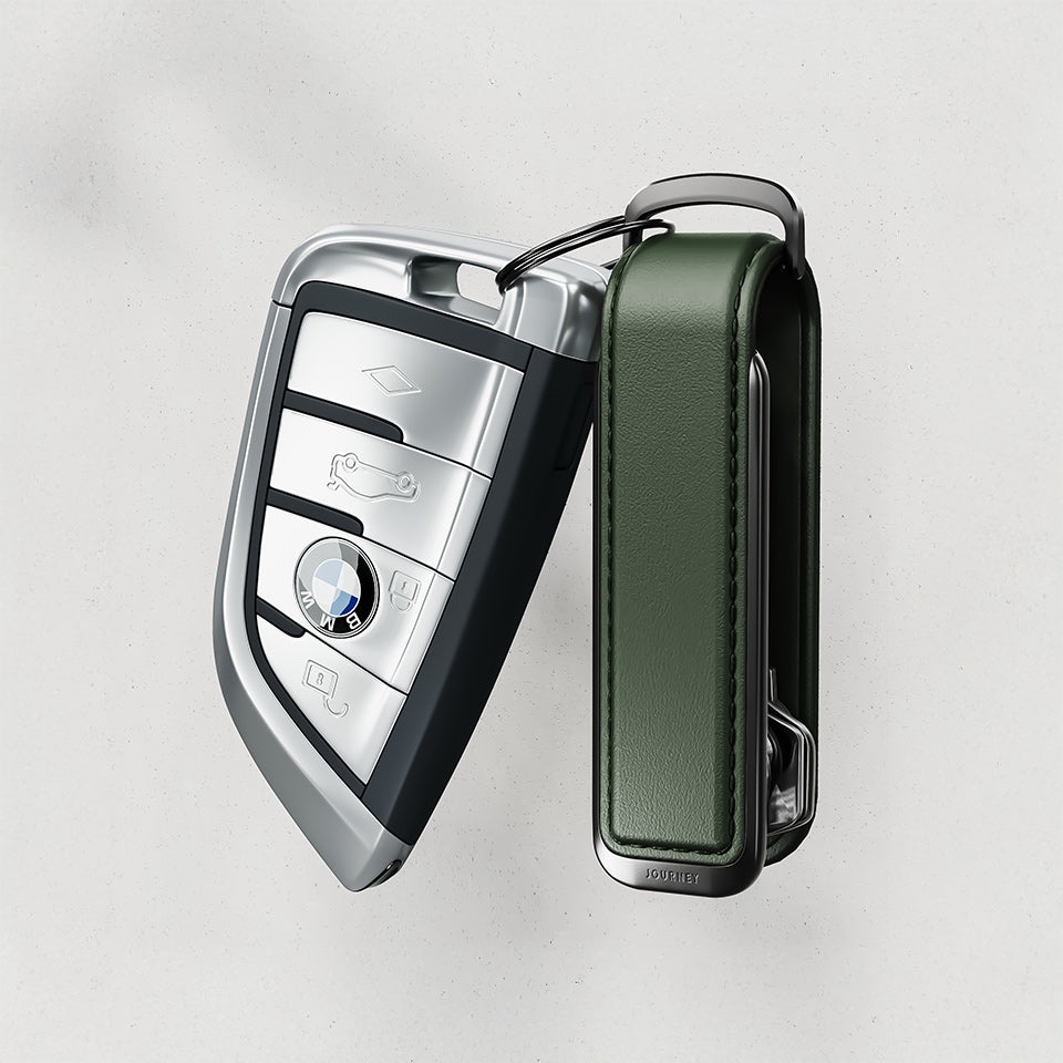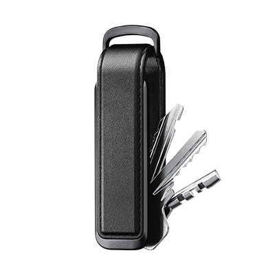 A. A minimalist key organiser made with Nappa leather and stainless-steel hardware. It stores up to six flat keys in a compact, silent stack and eliminates key jingling.